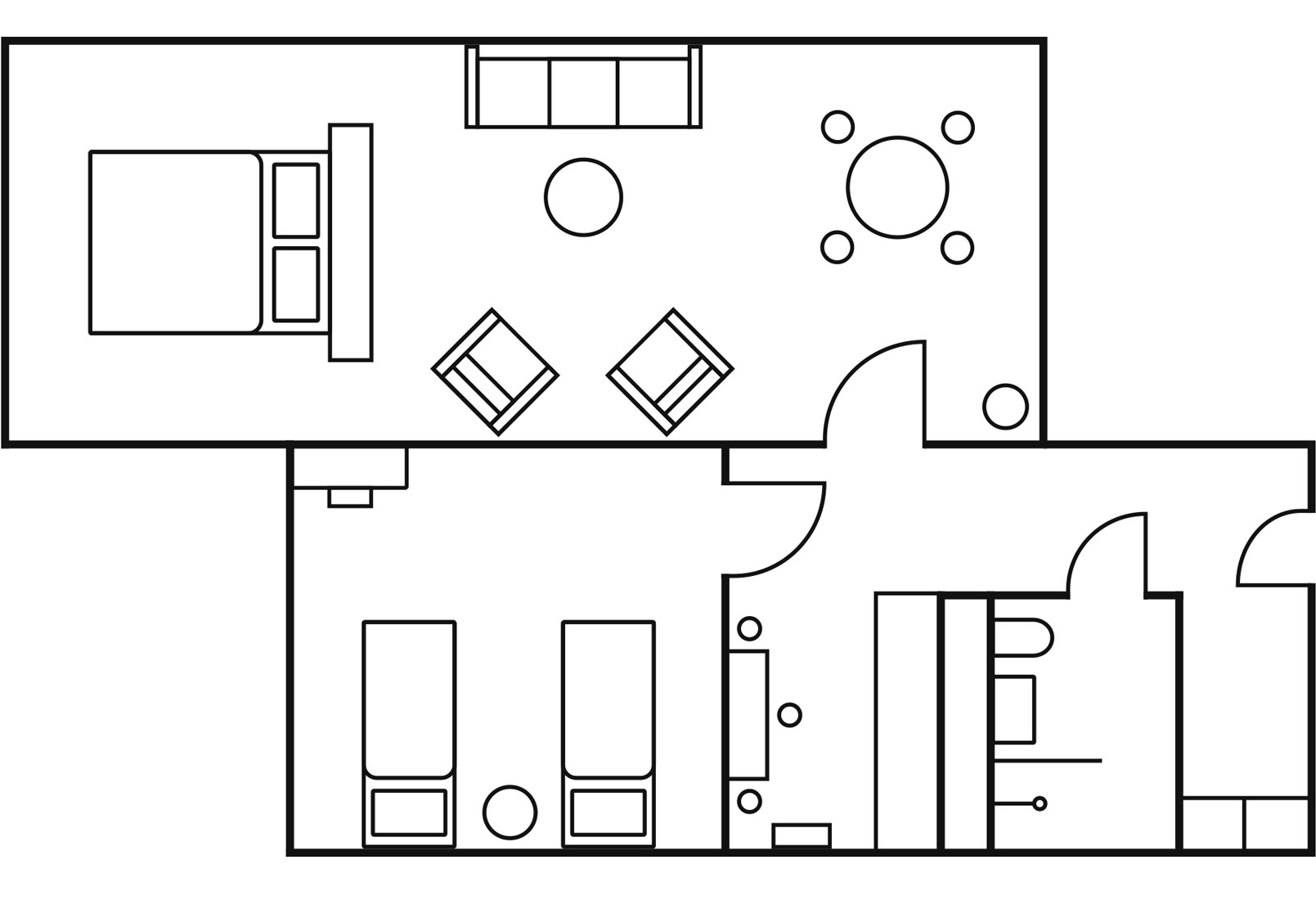 Im großen Zimmer kann man in der Couchlandschaft gemütlich beisammen sitzen oder Am Esstisch gemeinsam zu Abend essen. Das Doppelbett befindet sich durch einen stilvollen Raum-Trenner außerhalb vom Sichtbereich. Somit kannst du dein Bett auch gern mal unaufgeräumt lassen.